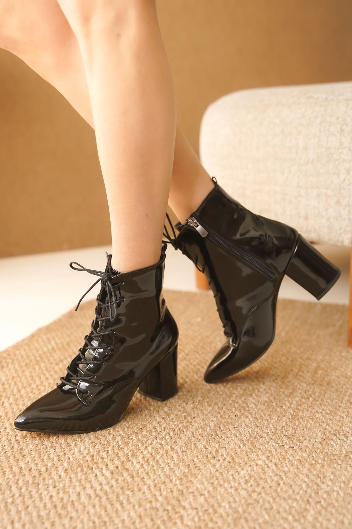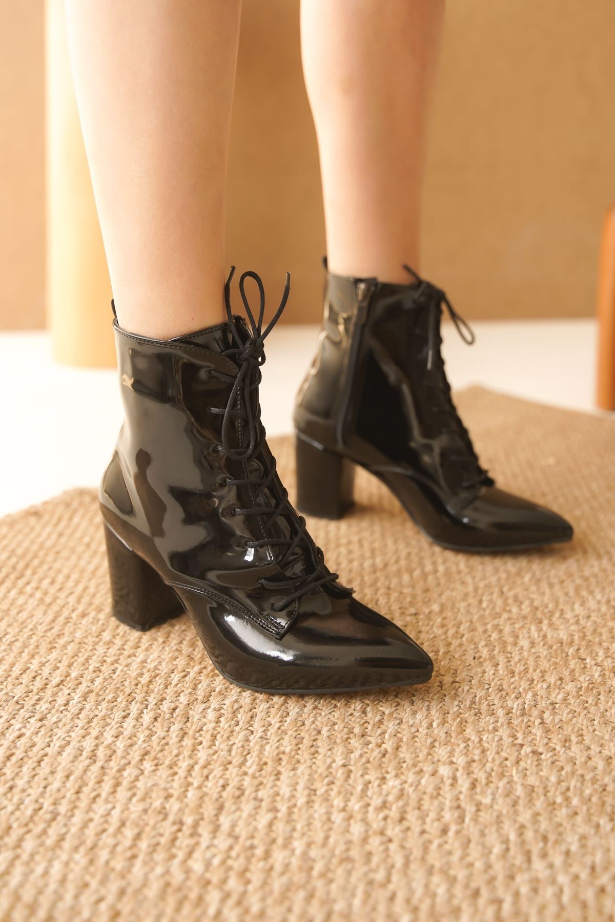 Kadın Candy Bağcıklı Sivri Burun Siyah Rugan Bot - Siyah