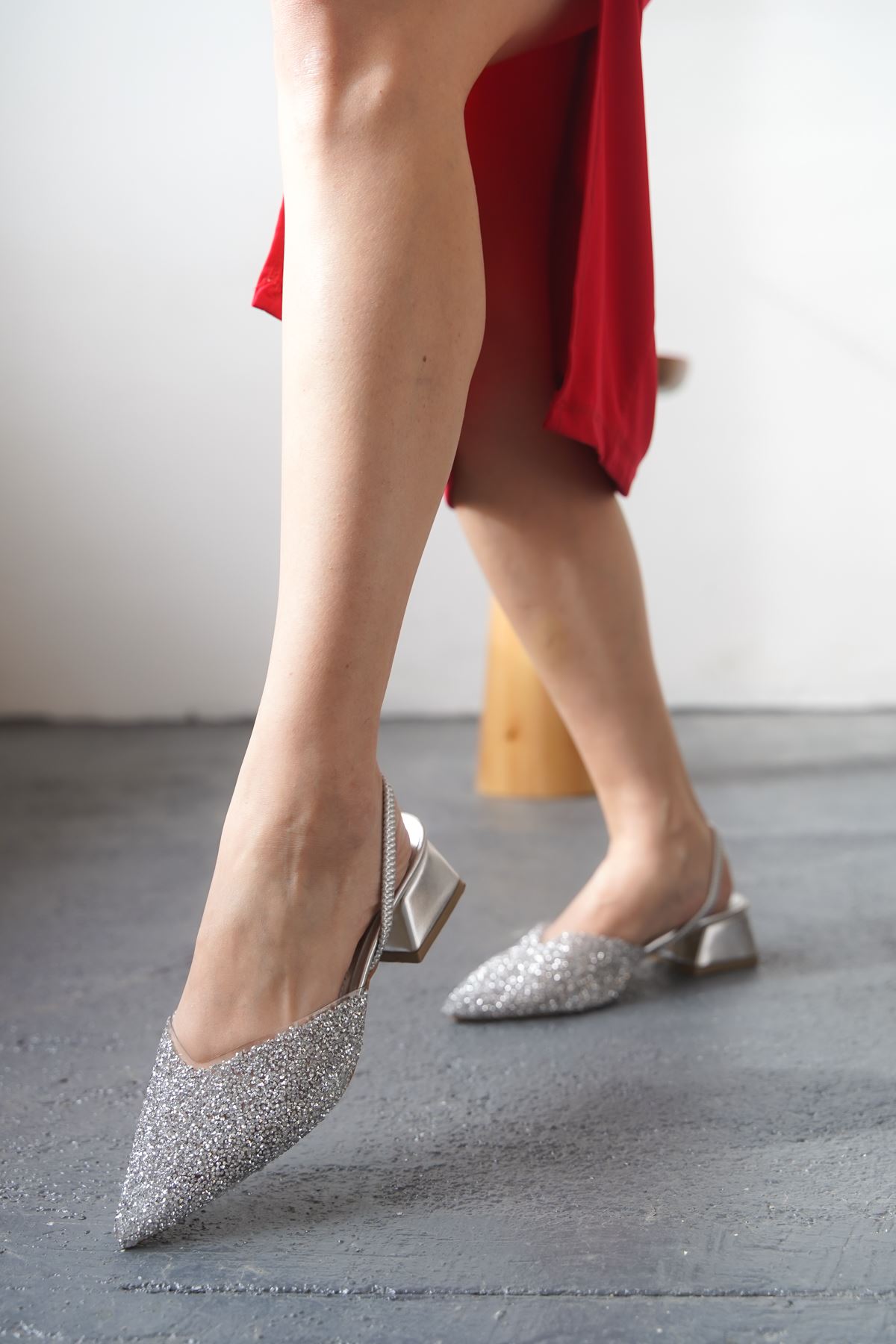 Kadın Enju Kısa Topuklu Cam Kırığı Taşlı Ayakkabı - Gümüş