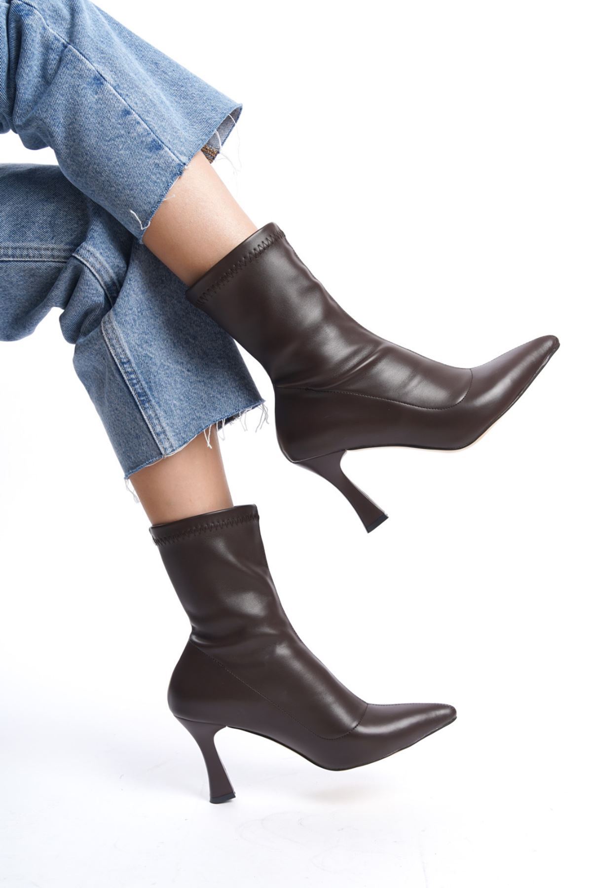 Kadın Lopez Streç Malzeme Sivri Burun Topuklu Bot - Kahve-Deri