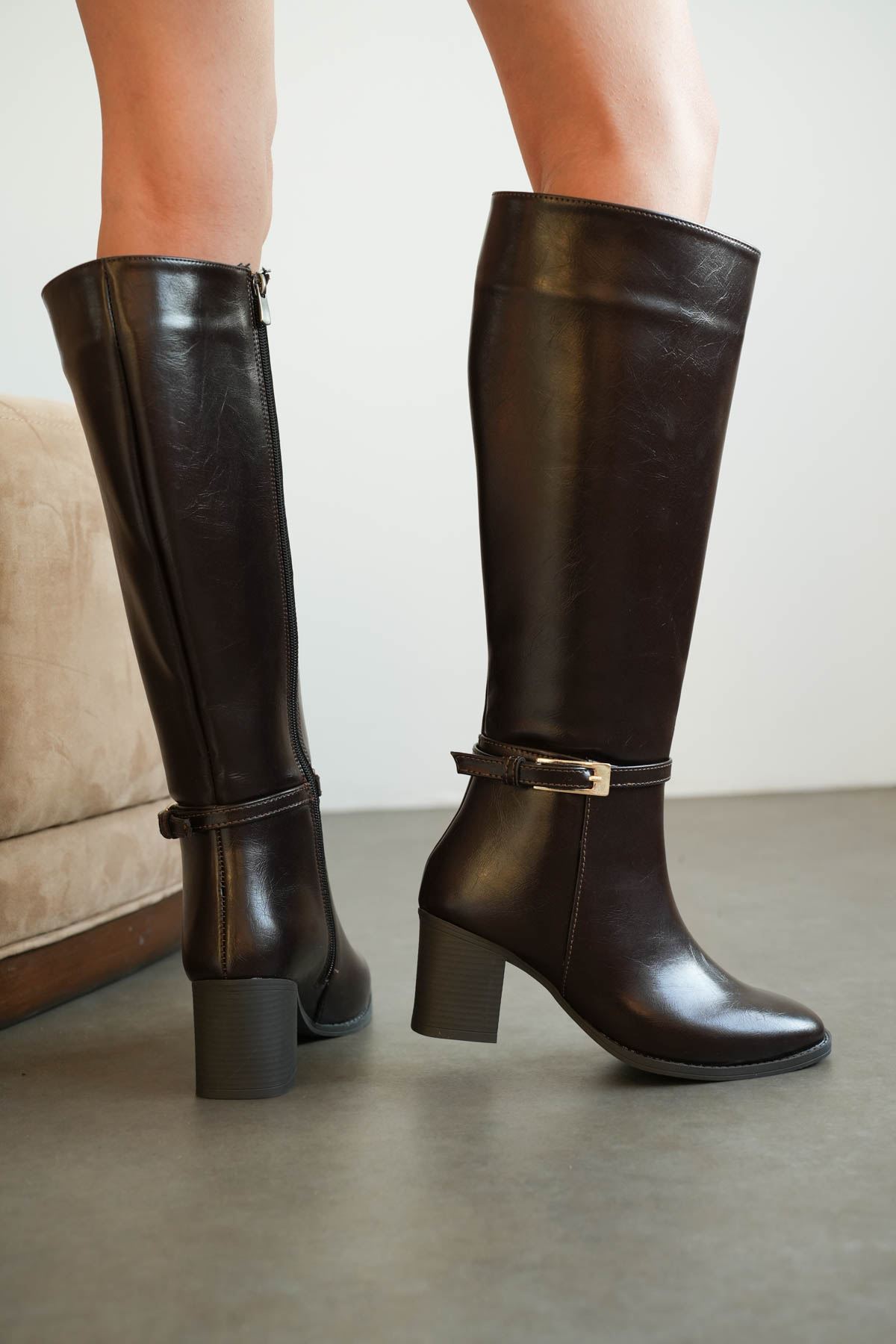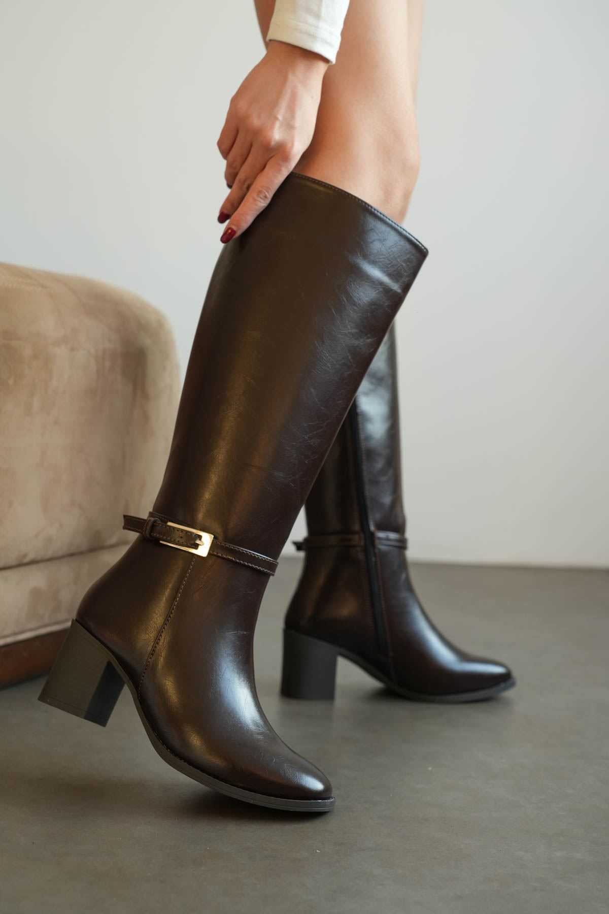 Kadın Luvec Kısa Topuklu Tokalı Çizme - Kahve-Deri