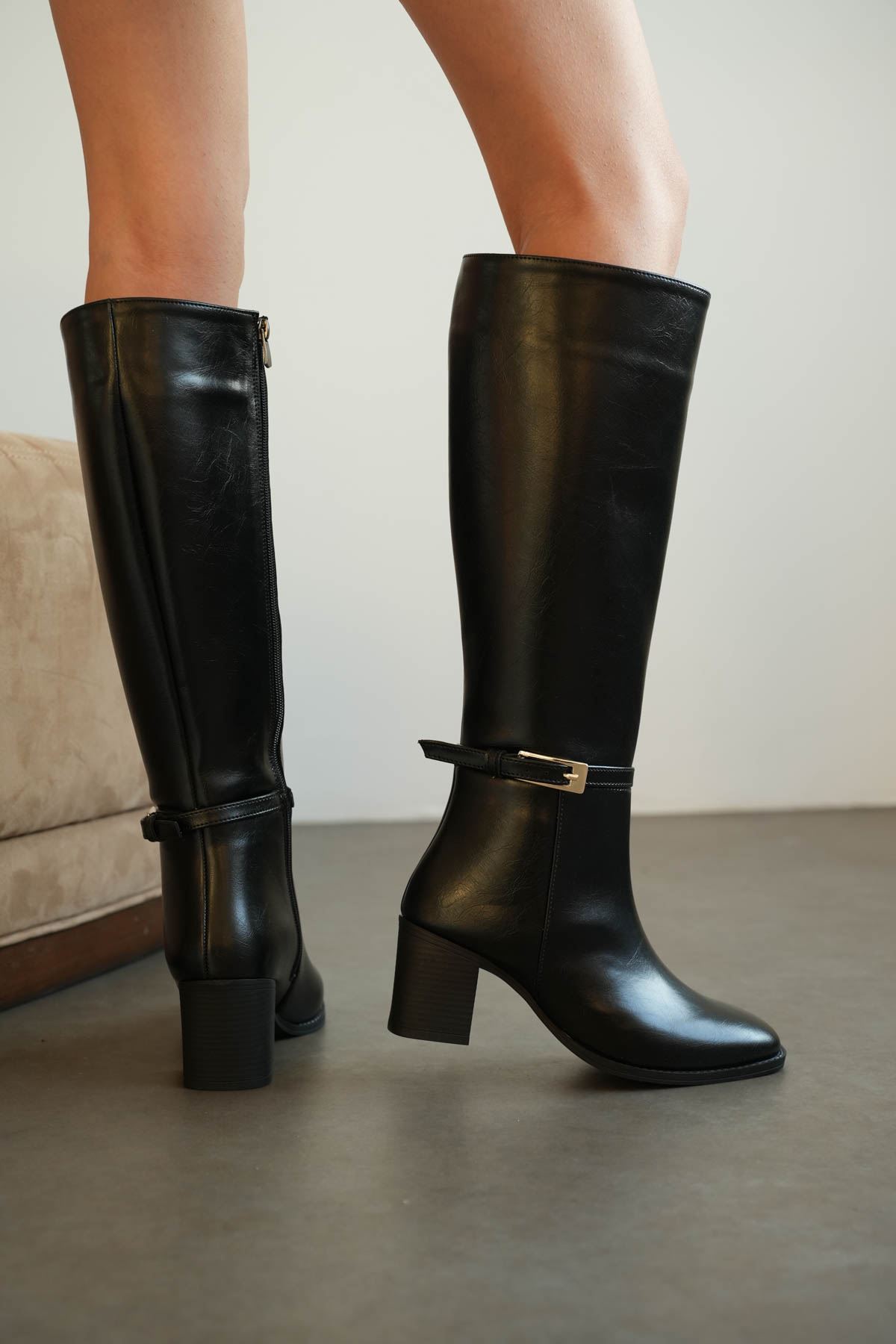 Kadın Luvec Kısa Topuklu Tokalı Çizme - siyah-deri