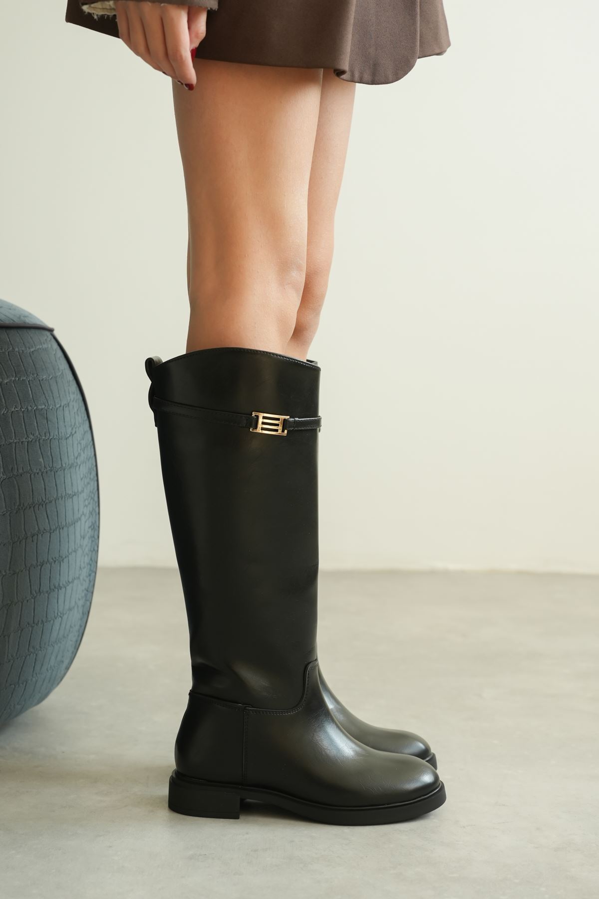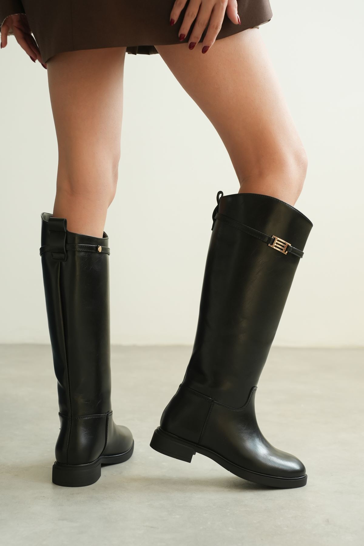 Kadın Nantes Düz Tabanlı Tokalı Çizme - siyah-rugan
